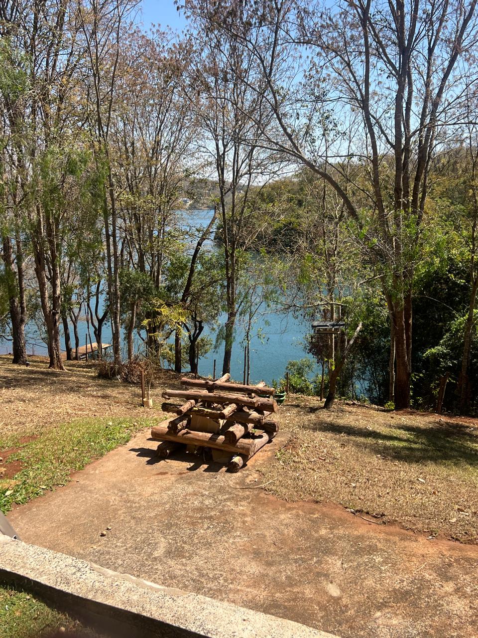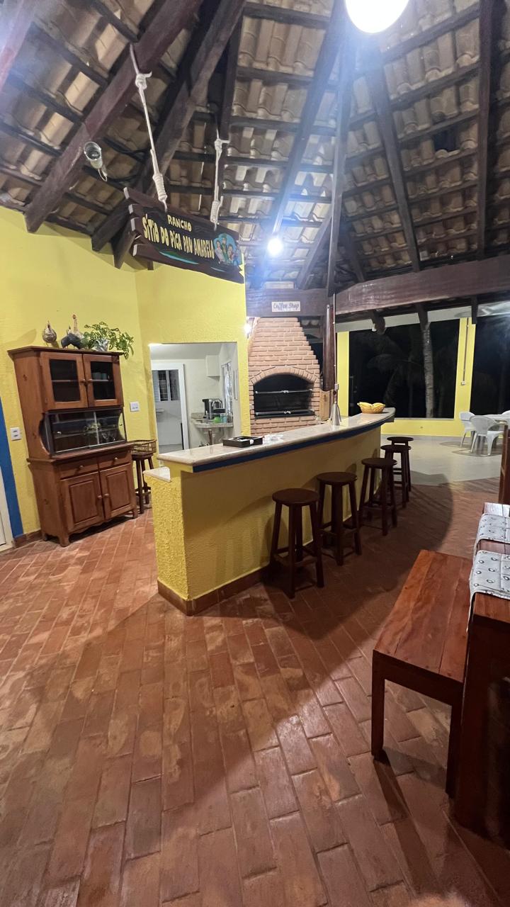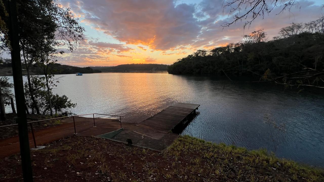 Sim! O rancho é à beira da Represa de Miranda, com píer privativo para lancha e área para banho.