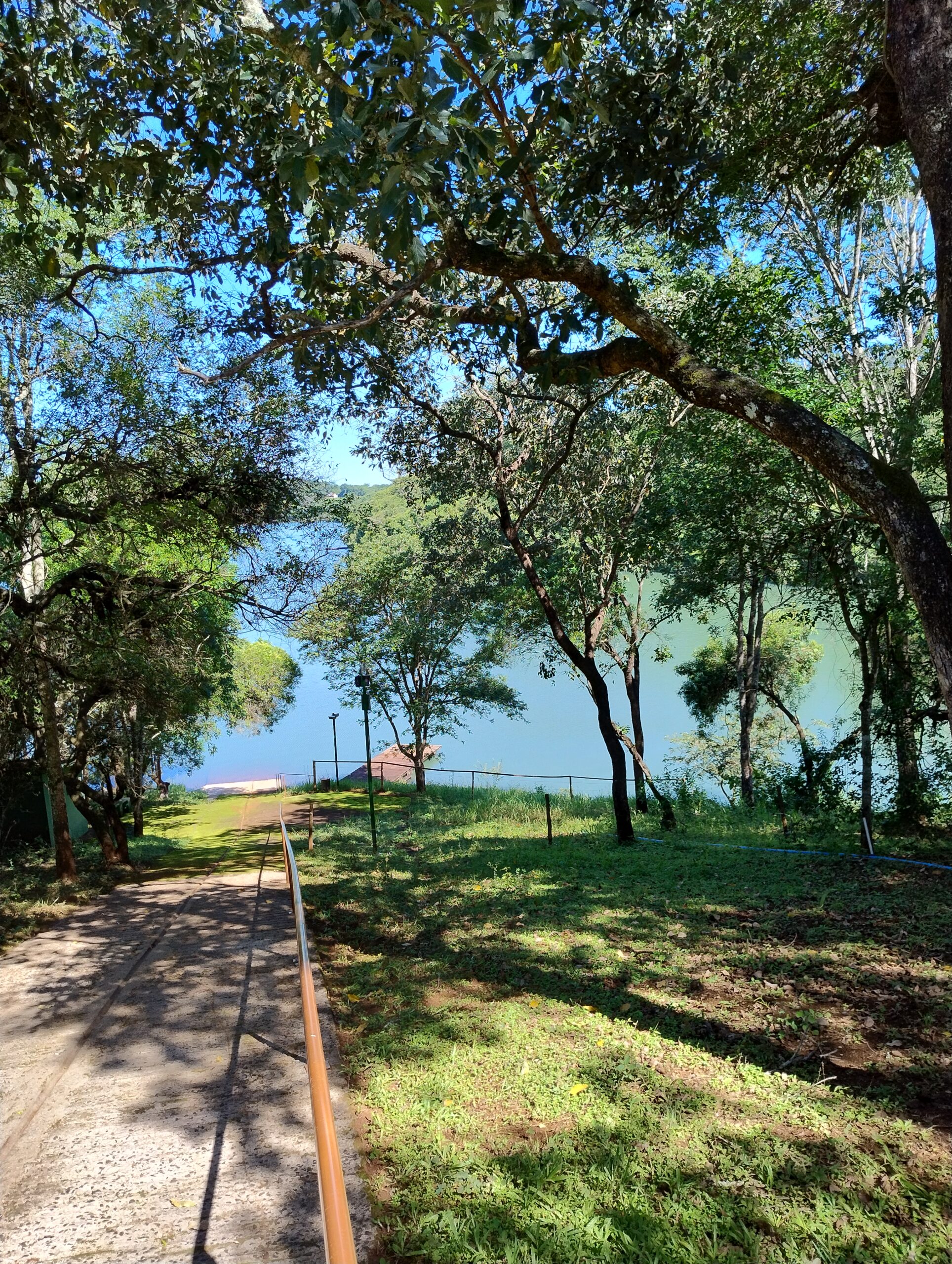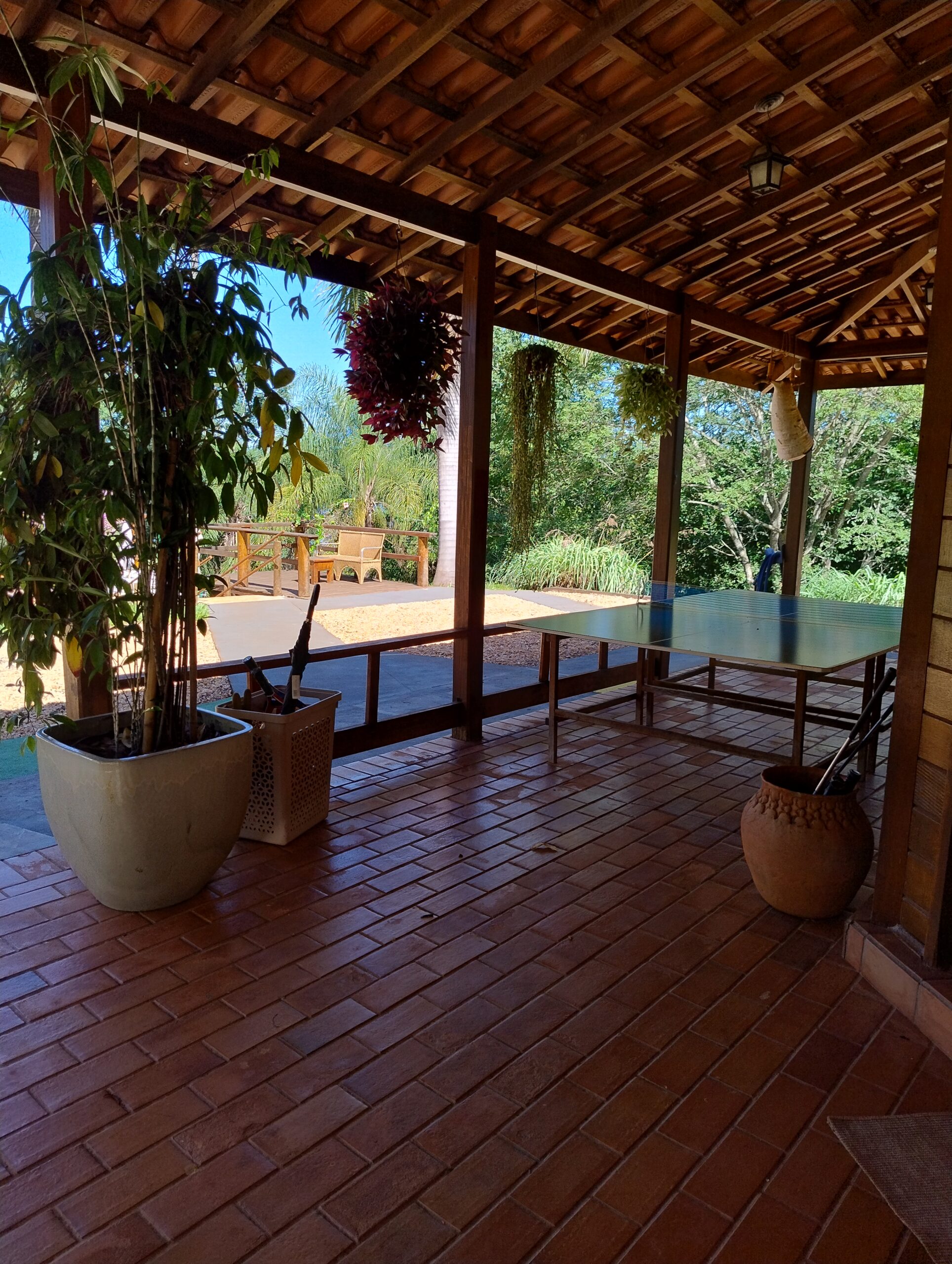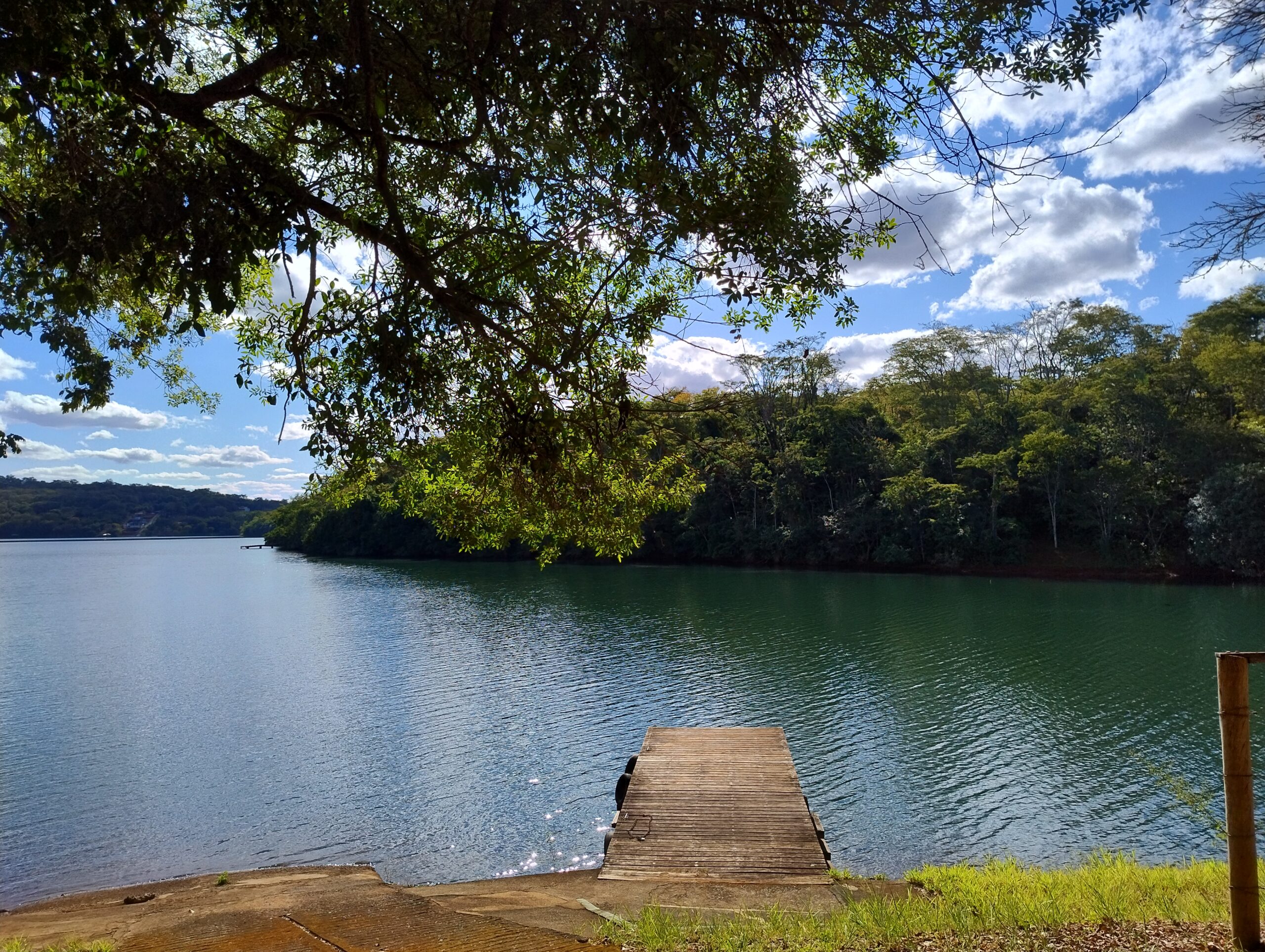Sim! O rancho é à beira da Represa de Miranda, com píer privativo para lancha e área para banho.
